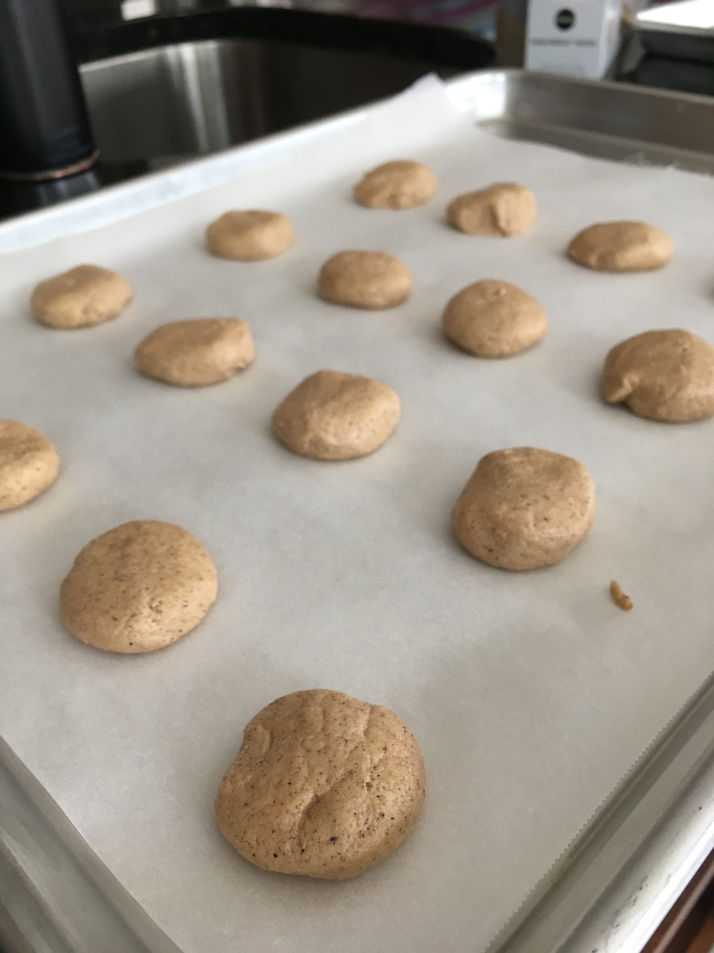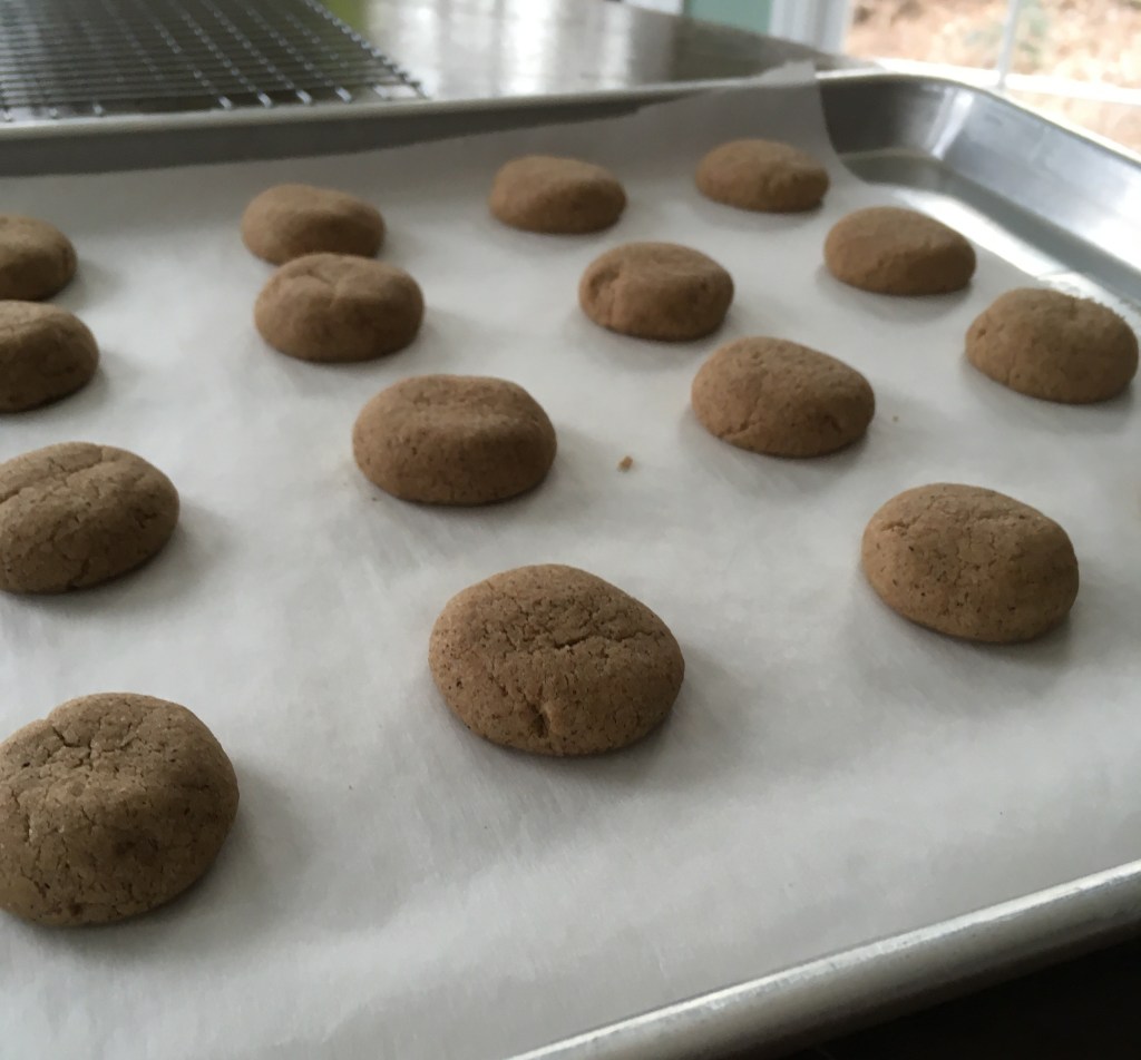 Roll dough into small balls (around 1/2 in diameter). Place on baking sheet and flatten slightly. Cookies should be at least an inch and a half apart. Bake for 20-25 minutes. Cookies are done when slightly cracked and barely give when squeezed. Let cookies cool 5 minutes on baking sheets before removing and placing them on cooling racks to cool completely.